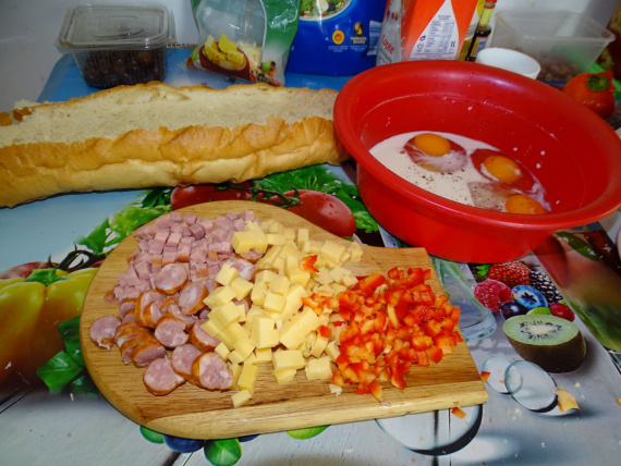 В молочно-яичную смесь добавьте хлебный мякиш, нарезанный сыр, ветчину, колбаски и перец. Хорошо перемешайте.
