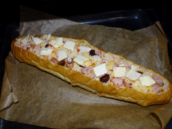 • Смажьте багет оливковым маслом и переложите внутрь начинку. Сверху добавьте маслины, тертый пармезан и нарезанное тонко сливочное масло.