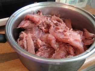 - В это время нарезаем филе тунца (я купила свежее) на маленькие кусочки и перепускаем через мясорубку.