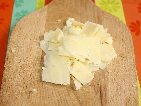 После того как мы приготовили грибную начинку переходим к сыру. Сыр можно натереть на терке или нарезать тонкими пластинами, на вкус блюда это не повлияет.