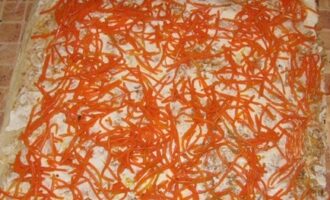 Берём первый лаваш, разворачиваем, смазываем майонезом и выкладываем корейскую морковку.
