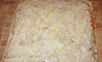 Третий лаваш смазываем майонезом и посыпаем сверху сыром.