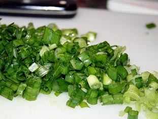 Промываем под проточной водой перья зеленого лука и с помощью ножа на разделочной доске мелко рубим ингредиент. Измельченный лук перекладываем в миску к редису.