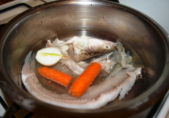 Залейте хребет судака (с головой и хвостом) 1,5 литрами воды. Добавьте очищенную морковь и лук. Поставьте все на огонь и доведите рыбный бульон до кипения. Снимите пену, добавьте лавровый лист, белый перец, соль, белое вино и уменьшите огонь. Продолжайте варить, не накрывая крышкой, в течение 1 часа. За это время бульон должен увариться до 1 литра. В то же время разведите желатин в небольшом количестве холодной воды, чтобы он набух. Желатин должен увеличиться в 3-4 раза. Готовый бульон пропустите через сито/дуршлаг, покрытый марлей в четыре слоя. Затем, чтобы сделать заливное прозрачным, добавьте в него взбитый в крепкую пену белок. Очень хорошо перемешайте все вместе, а затем вновь процедите через чистую марлю, сложенную в четыре слоя. В горячий бульон (то есть пока вы его очищаете и процеживаете, он не должен остыть) добавьте размоченный желатин. Добавляйте желатин ложками, хорошо размешивая бульон после каждой, чтобы жидкость соединилась. Теперь накройте ваш бульон и дайте ему остыть до комнатной температуры.