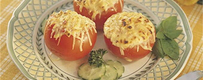 Помидоры, фаршированные ветчиной и сыром подавайте в горячем виде, никакого соуса к ним не нужно, но в качестве гарнира можно предложить немного свежих огурчиков или других овощей. В зависимости от размеров помидор, можно подавать их как второе блюдо, либо как закуску. Согласитесь, маленькие фаршированные помидоры черри очень аппетитно будут смотреться на любом праздничном столе. Так что экспериментируйте и удивляйте, а так же наслаждайтесь вкусом запеченных под сырной корочкой овощей.
