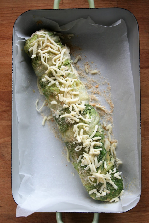- Осторожно перенесите рулет на форму для запекания (обязательно накройте ее пергаментом для выпечки). Снимите с рулета пленку. Смажьте верз взбитым яйцом, посыпьте панировочными сухарями и моцареллой.