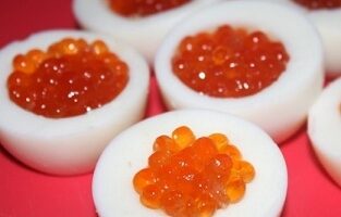 Половинки яиц, а точнее белков, начиняем красной икрой, размещая её как можно более равномерно и аккуратно.