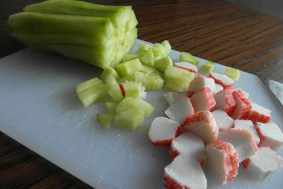 Крабовые палочки очистите и нарежьте их кубиками среднего размера. Огурец промойте, снимите с него шкурку, а после нарежьте овощ кубиками.