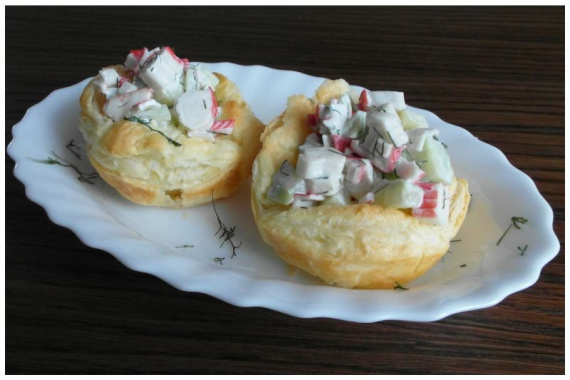 Между тем тарталетки из слоеного теста наверняка остыли и можно теперь наполнить их салатом с крабовыми палочками и огурцом. Все готово! Теперь вы можете либо сразу подать закуску к столу, либо отправить ее ненадолго в холодильник, например, если готовите заранее.