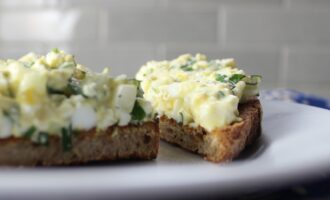 Яичный салат с крабовыми палочками — элементарный в приготовлении салат, готовлю его на завтрак и подаю с хлебом
