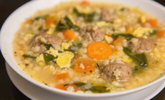 Очень вкусный густой суп с фрикадельками из говяжьего фарша с добавлением сыра Пармезан. Сочетание овощей, шпината, яиц