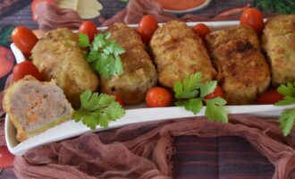Жареные голубцы из пекинской капусты — покрытые хрустящей корочкой мини голубцы. Сочные внутри, с кусочками овощей