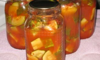Вкусный салат из кабачков в томатном соусе на зиму будет напоминать вам холодной зимой о солнечном лете.